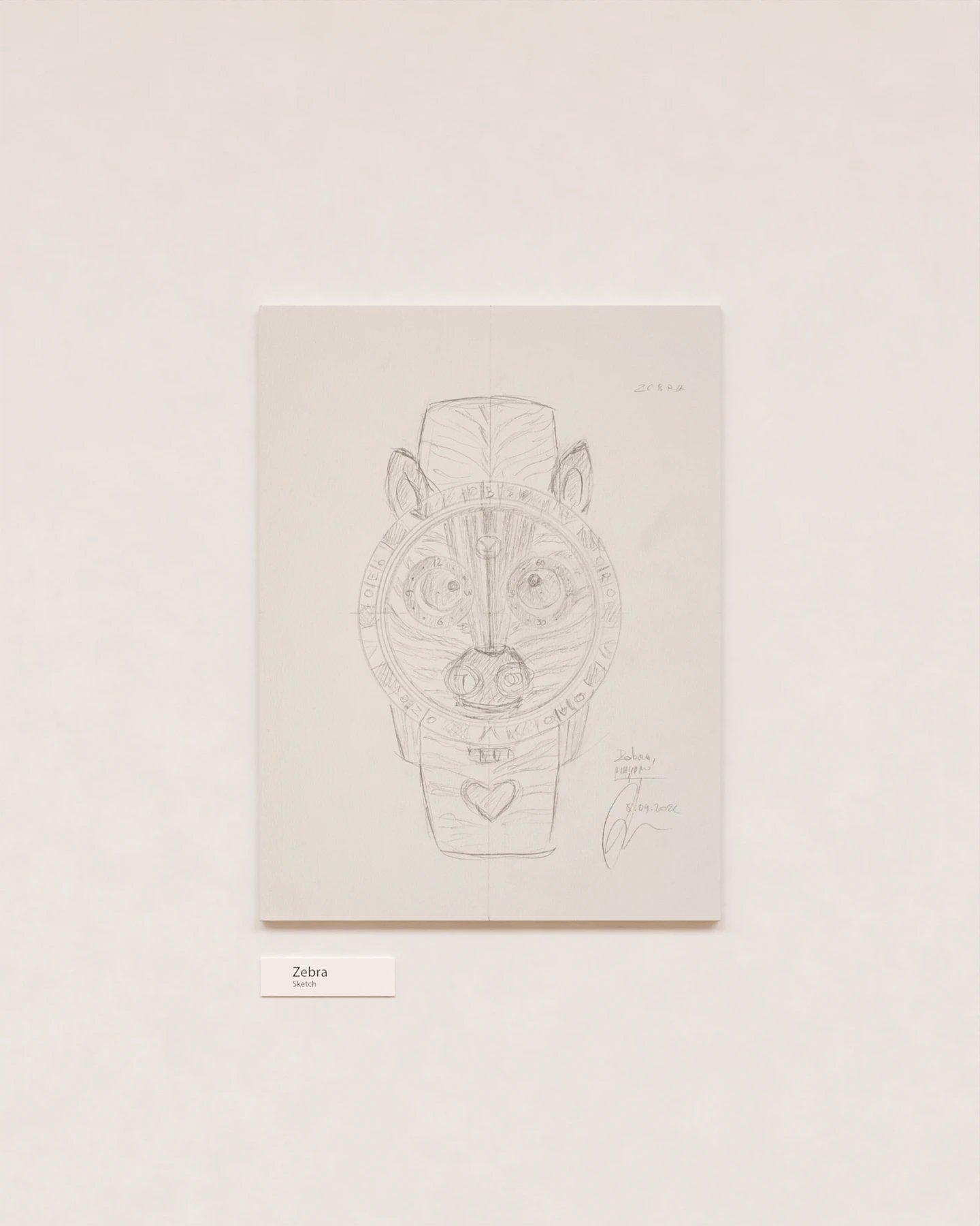 One feature not immediately apparent from the drawing is an entirely new indicator, never before seen in the Wristmons collection: when the crown is pulled out, the background of the Zebra’s smile changes from white to red. The sketch bears the master’s signature and the date of completion – 8 September 2022. Dimensions of the drawing: 24 × 32 cm.