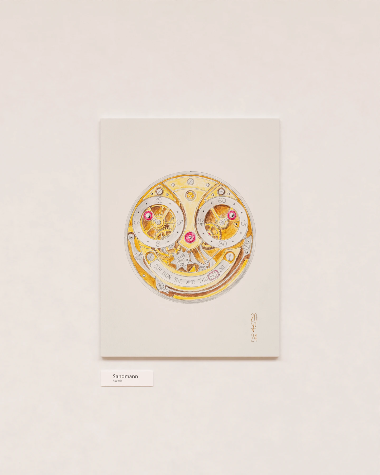 Completing the composition is Chaykin’s signature smile – here embodied as a sector-shaped (retrograde) day-of-the-week display with a framed pointer. The sketch bears the master’s signature and the year of completion – 2024. Dimensions of the drawing: 24 × 32 cm