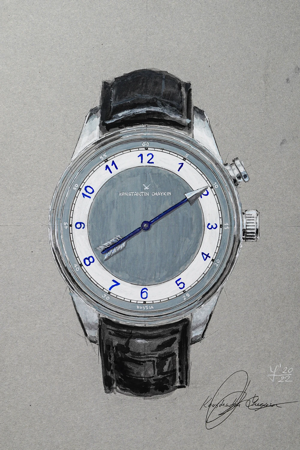 The sketch depicts the steel-cased Genius Temporis Blue Arrow watch, the first version of Konstantin Chaykin's famous "one-hand" model. The watch features a unique complication, switchable hour and minute indication with the same hand. This invention was patented by Chaykin. The Genius Temporis Blue Arrow model was first introduced at the BaselWorld-2014 exhibition.
