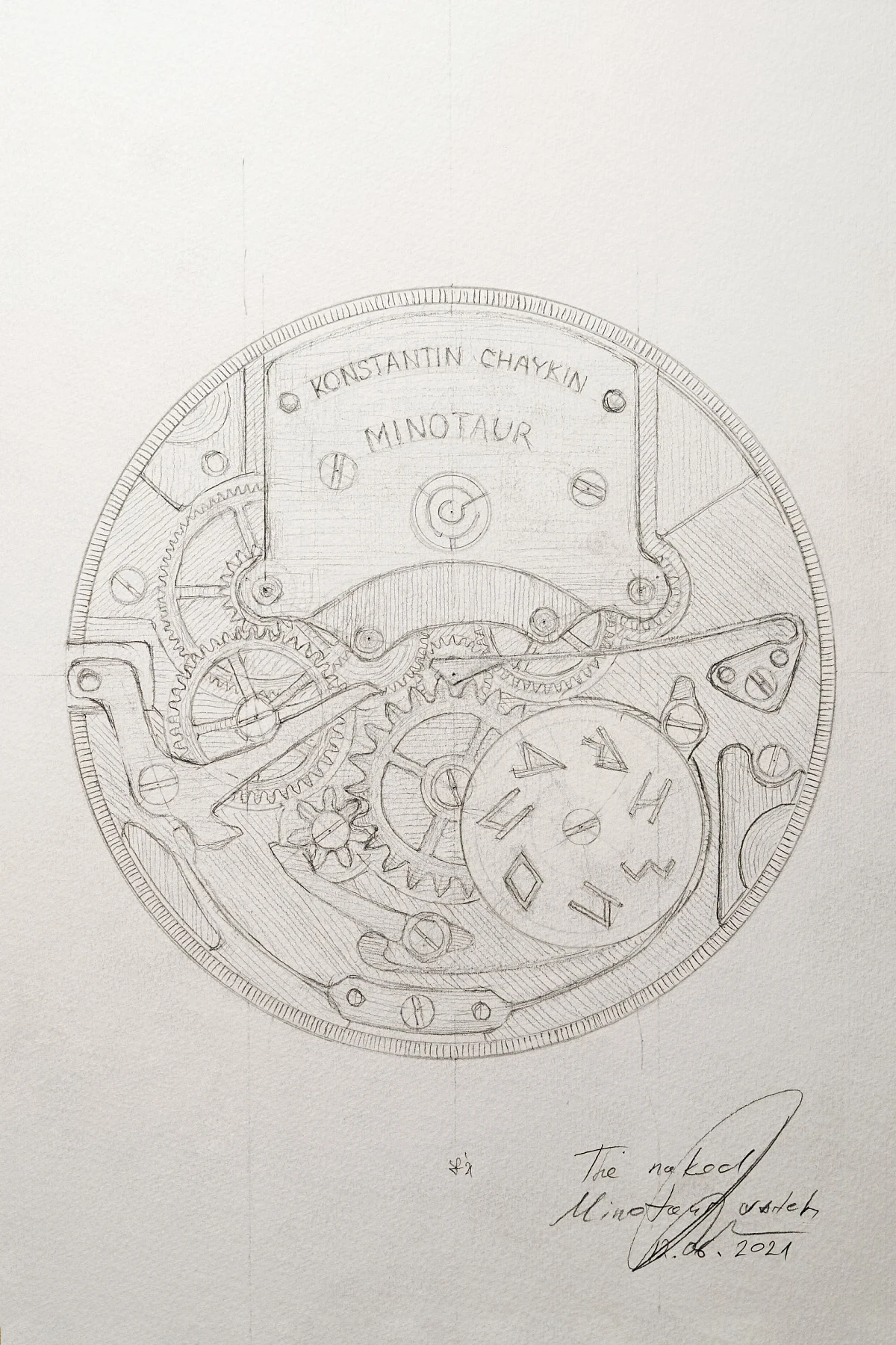 This is a sketch of the Minotaur watch's movement. The watchmaker invented and patented the two-disk day indicator especially for this watch. The sketch shows a design with two circles at the bottom of the movement.