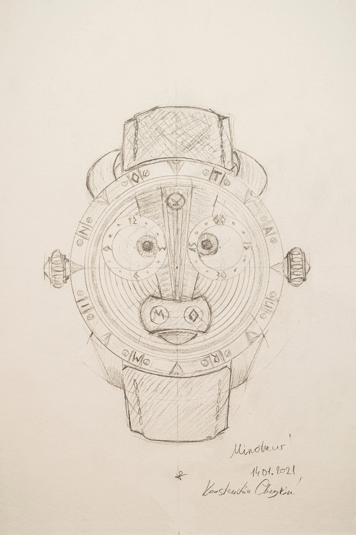 This Chaykin's sketch of the Minotaur watch, inspired by the famous Greek myth about the fantastic creature with a bull's head, shows all the main details of this piece. The master has realized the «features» of the Minotaur in every part of the watch.