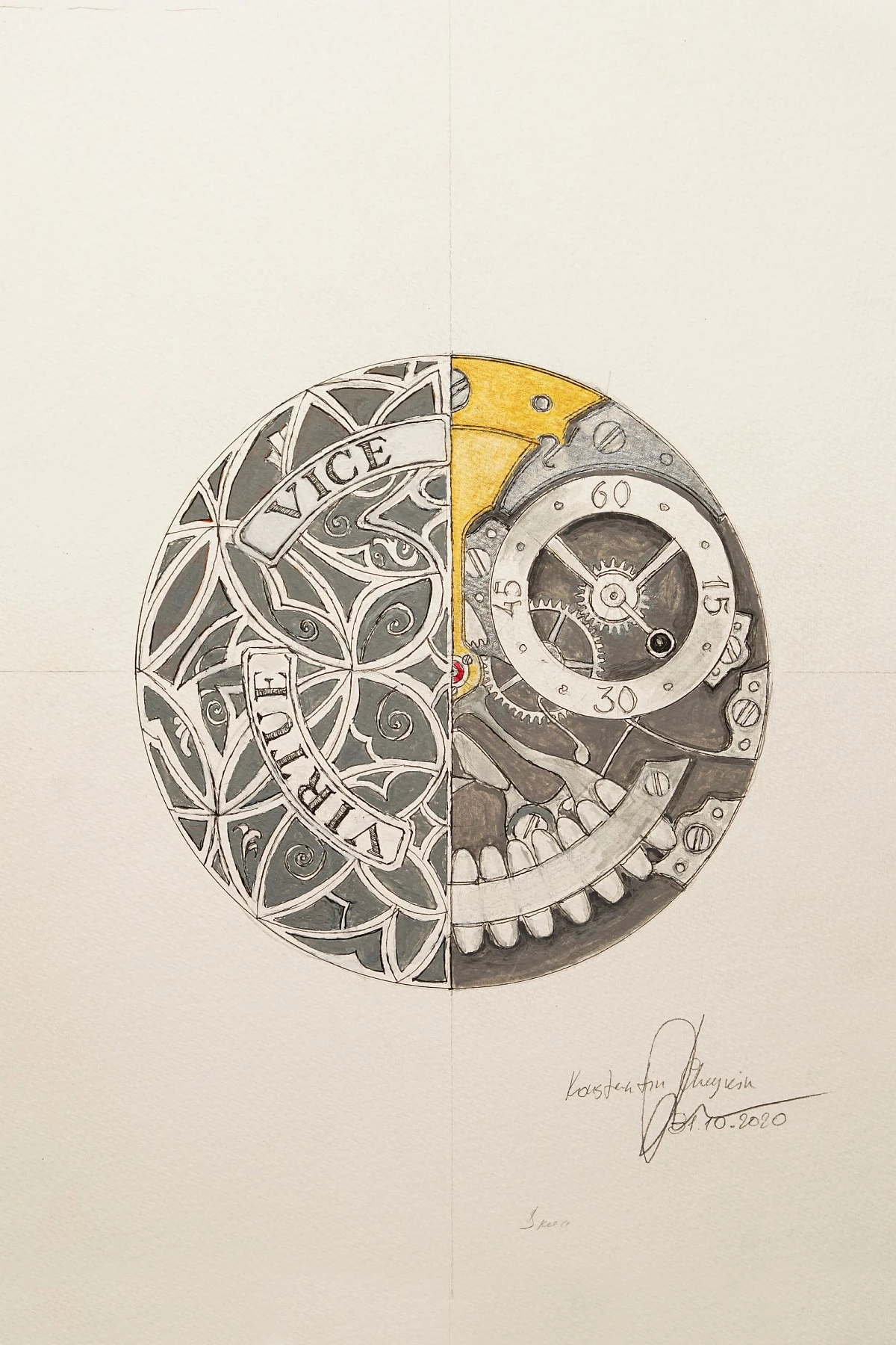 Chaykin expressed this contradiction in his sketches. In the first one, you can see a rotating curtain on the left with an intricate ornament in the spirit of the British Arts & Crafts. The right part is a skeletonized movement with a round "eye" (a minute indicator). The master used the technique of grisaille to highlight a fragment of the movement in brass colored watercolor. The second sketch shows the left, "virtuous" part of the dial, hidden by the ornamentation.