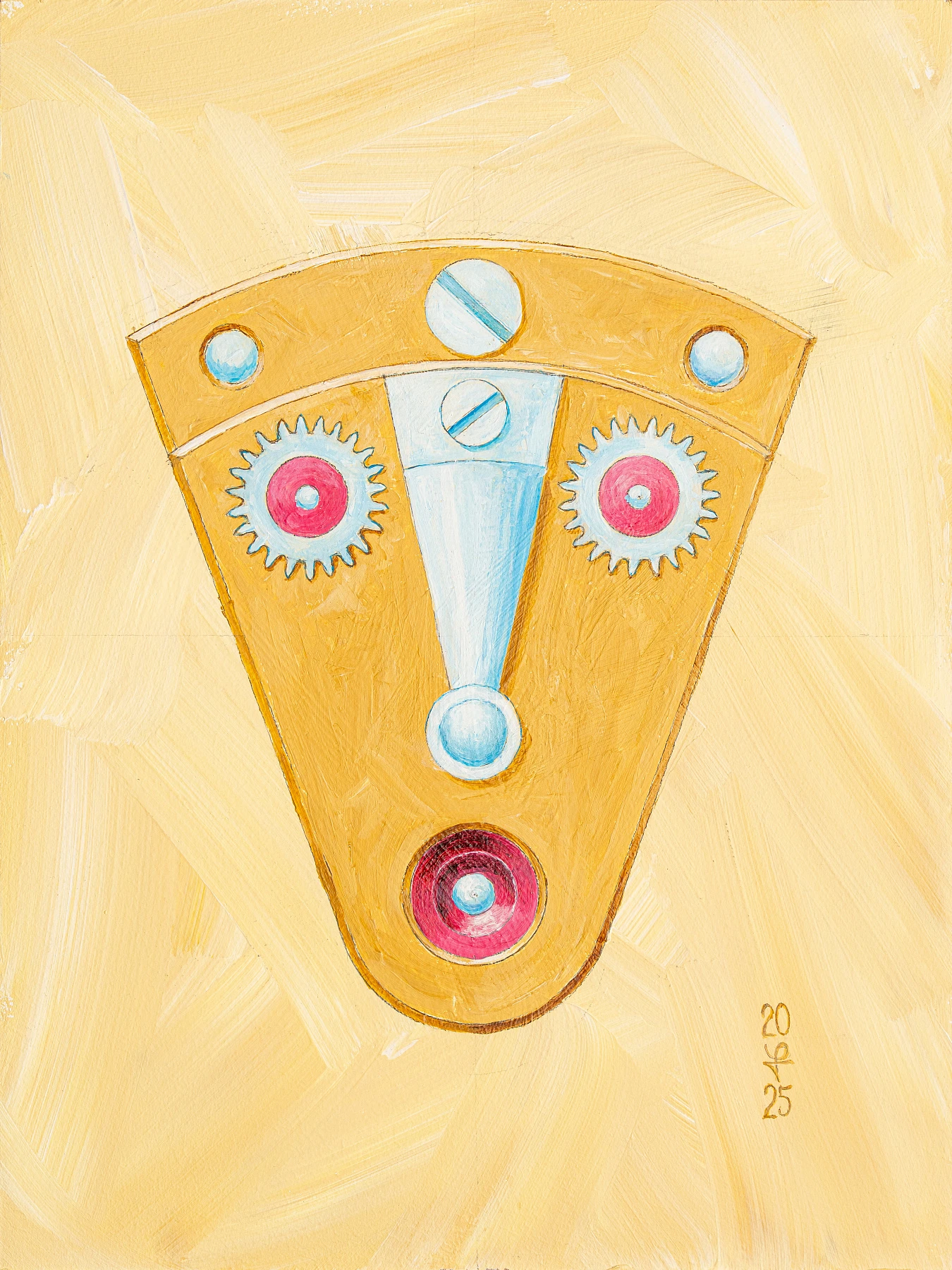 A fan‑shaped regulator plate and a set of screws turn into a stern, almost totemic face, while preserving the metallic texture of bronze against a warm ochre ground.