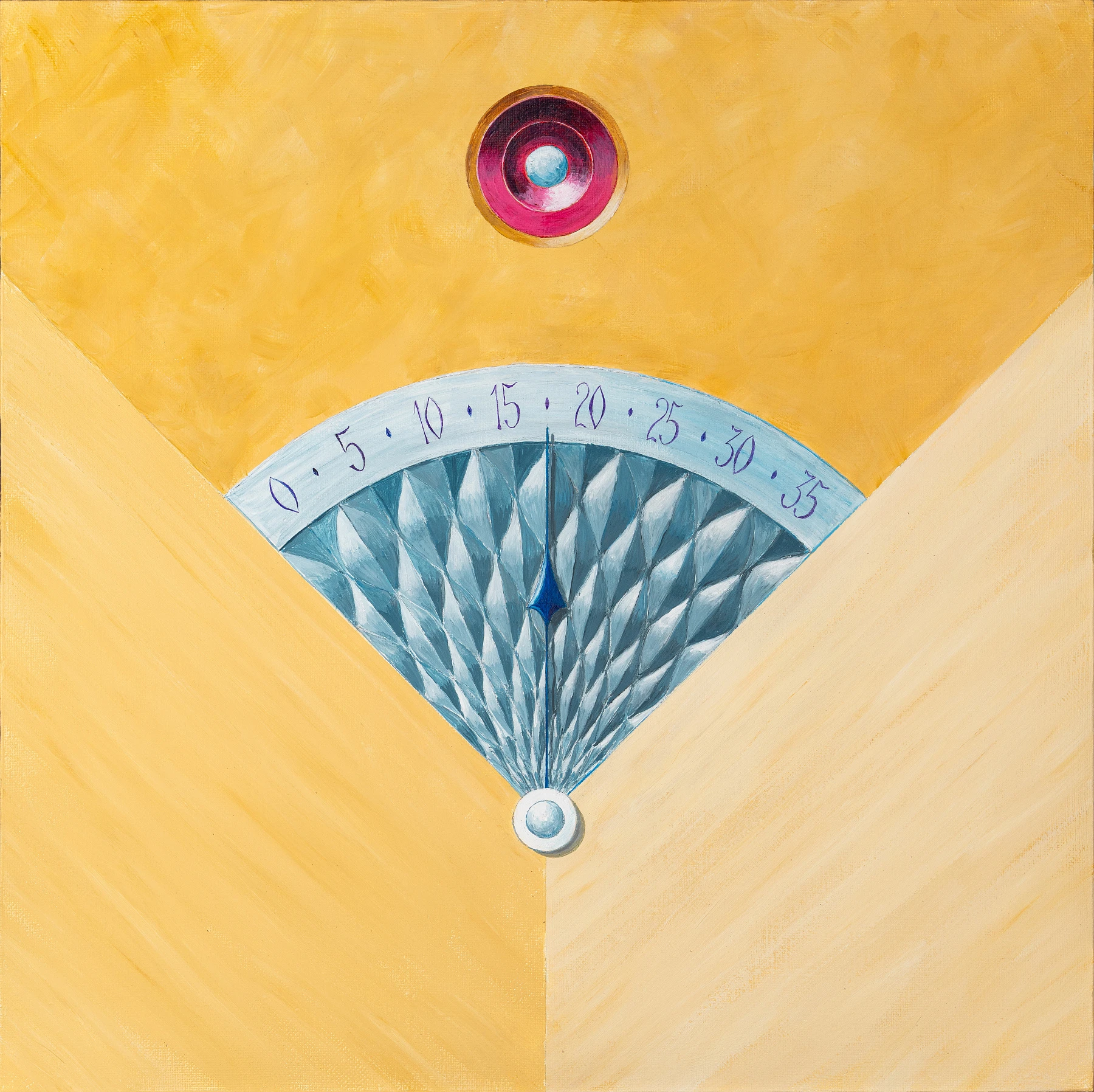 Two golden planes converge at a sharp angle, forming a sacred triangle. Inside, a shimmering silver fan of the retrograde scale glints; its ripples recall delicate skin, while a blue ray‐hand slides down to the zero mark like the poised anticipation of a touch. Above the center, a ruby heart‐stone blazes, holding the tension between technical precision and the sensuous premonition of a new cycle.