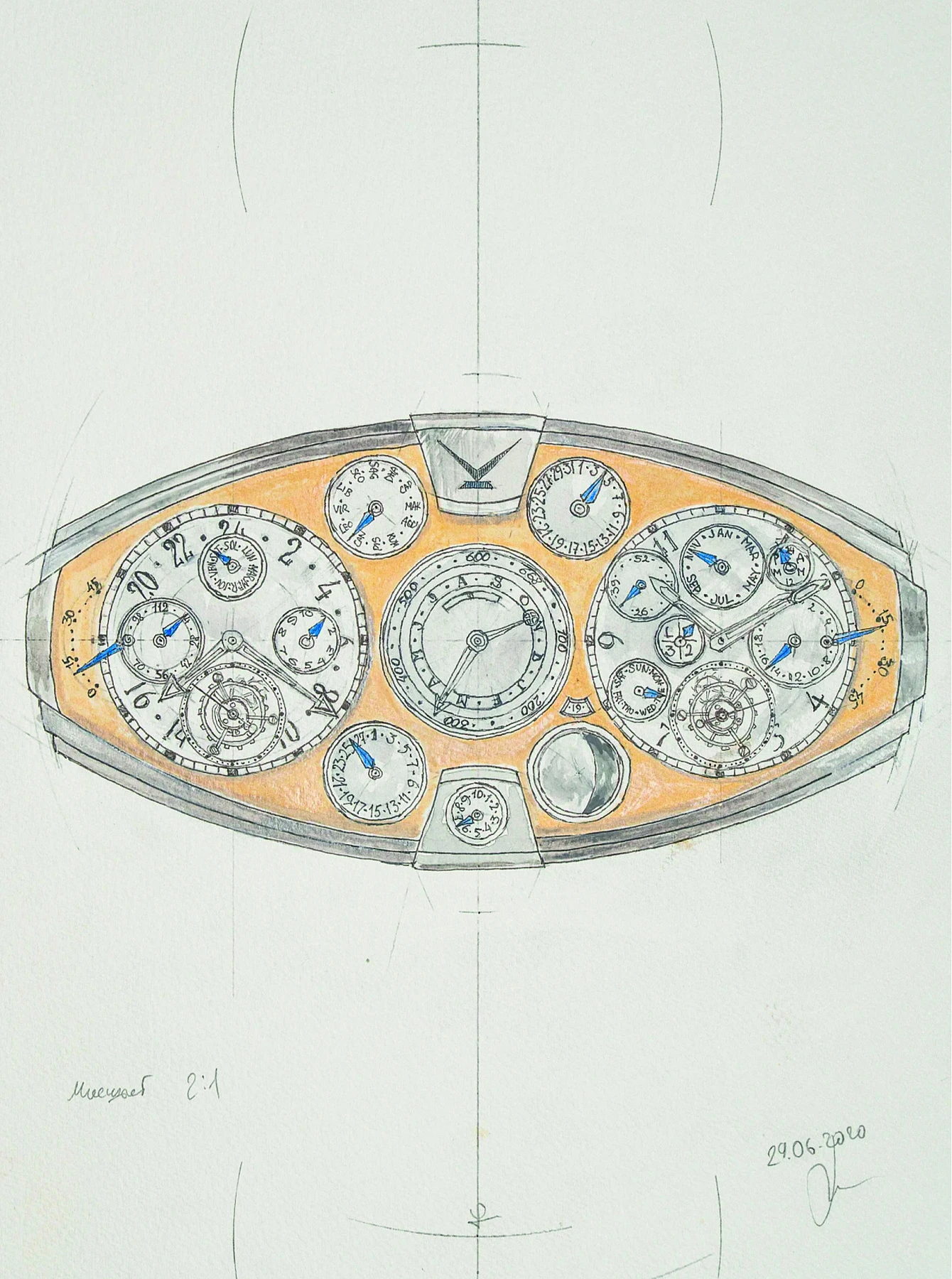 This artistically executed sketch depicts the front side of the Magnum Opus Mars Traveller watch – envisioned by Konstantin Chaykin as the pinnacle of his “Mars Time”