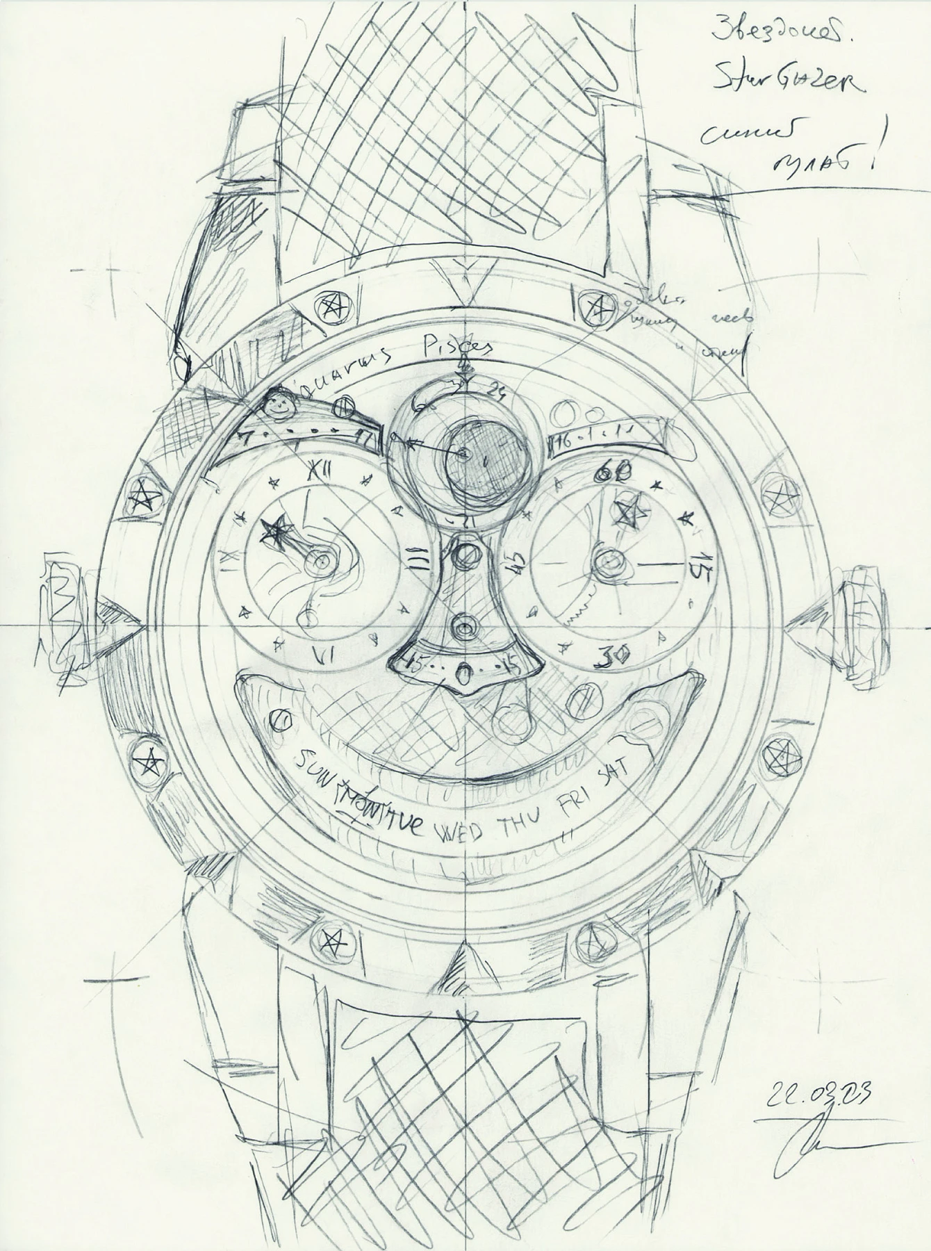 Already in this sketch, dated 22 March 2023, all the key features of the "Stargazer" watch are present. It shows all the indications on this side of the highly complicated movement. The double lugs for attaching the strap make it possible to wear the watch with either side facing up. Stars are used in the decoration of the bezel and the dial. Chaykin also noted that the watch would be produced in bulat steel.