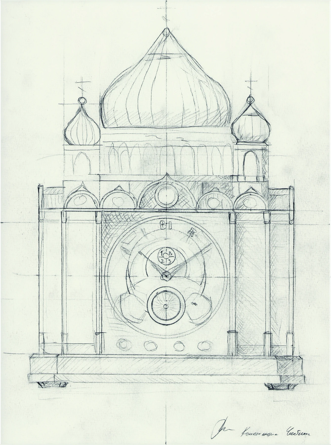 One of the preliminary design variants for Konstantin Chaykin’s third "Easter Computus" clock, in which he explores an architectural prototype for the piece.