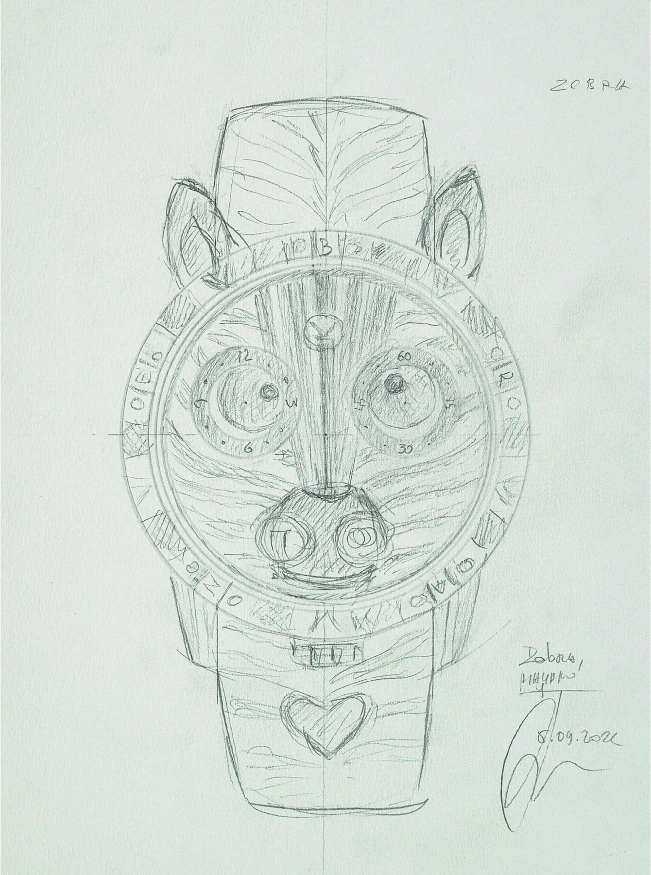 One feature not immediately apparent from the drawing is an entirely new indicator, never before seen in the Wristmons collection: when the crown is pulled out, the background of the Zebra’s smile changes from white to red. The sketch bears the master’s signature and the date of completion – 8 September 2022. Dimensions of the drawing: 24 × 32 cm.