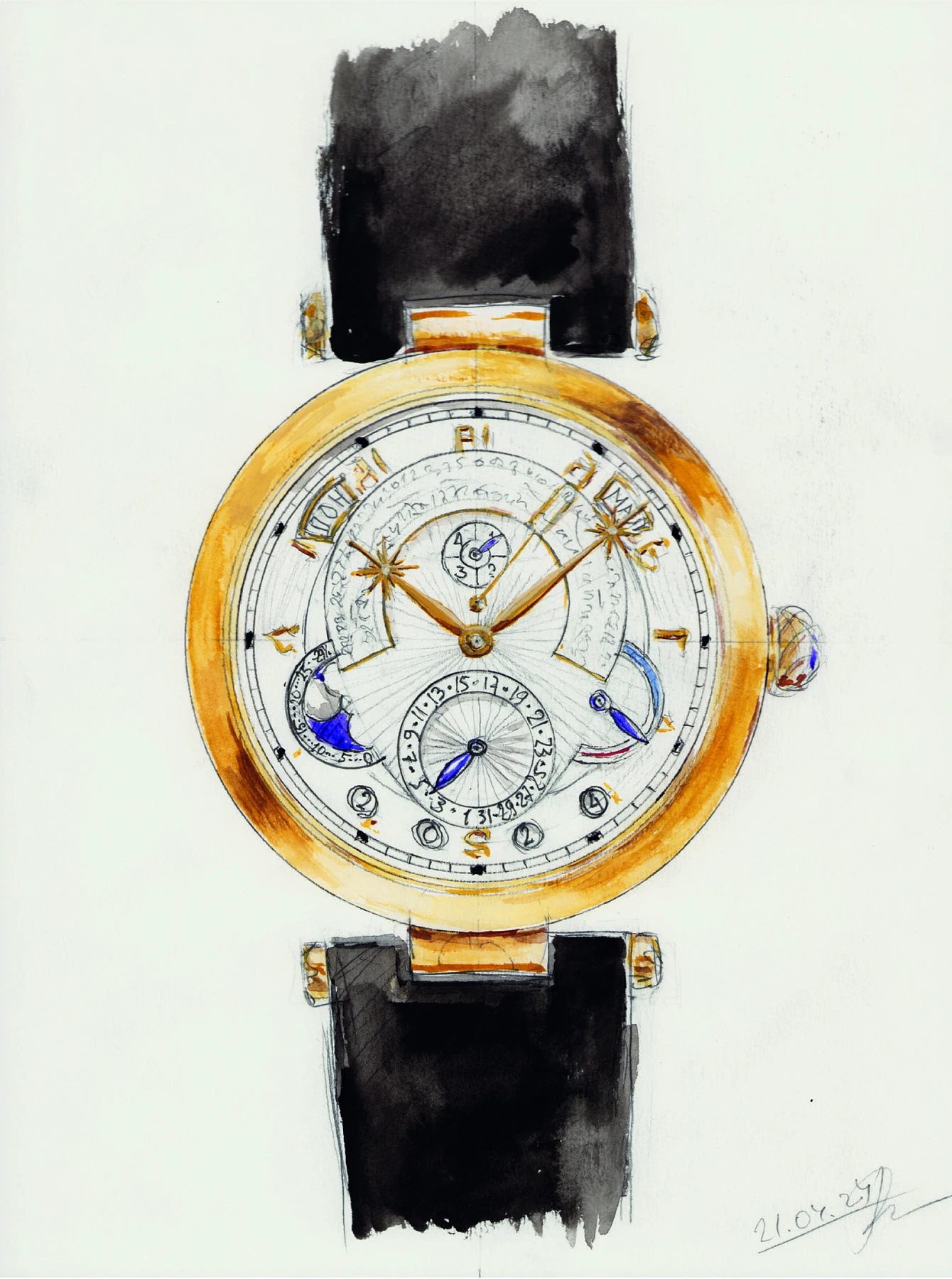 While preparing this project, he filed a patent application describing the design of such a clock, where he also mentioned a wristwatch with the same indicator and a perpetual calendar. In the same year, Chaykin created a prototype of the "Easter Computus" wristwatch and has since periodically returned to this highly challenging idea. This sketch shows a variant of the design for that very "Easter Computus" wristwatch prototype from 2007.