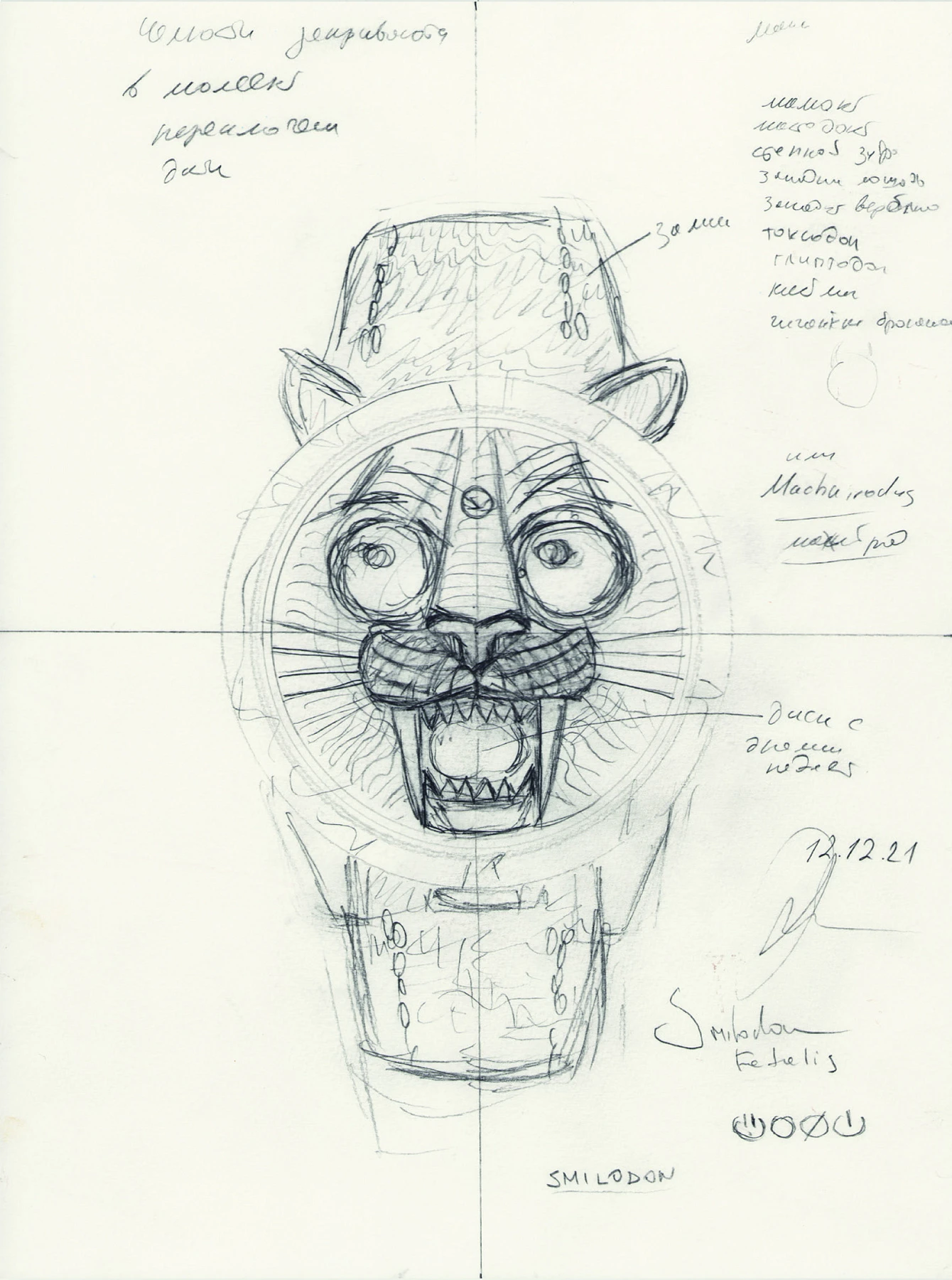 In this sketch, Konstantin Chaykin depicts one of the preliminary versions of the “Smilodon” model, which was ultimately brought to life in the finished watch with almost no changes.