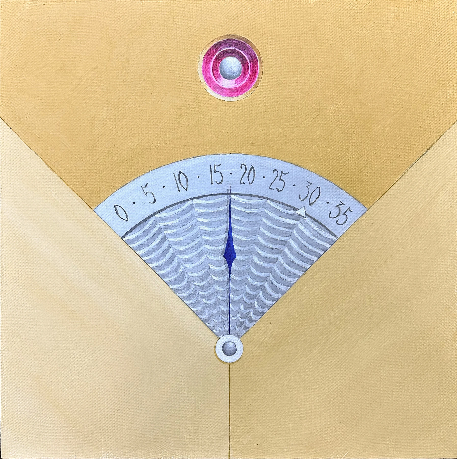 Two golden planes converge at a sharp angle, forming a sacred triangle. Inside, a shimmering silver fan of the retrograde scale glints; its ripples recall delicate skin, while a blue ray‑hand slides down to the zero mark like the poised anticipation of a touch.