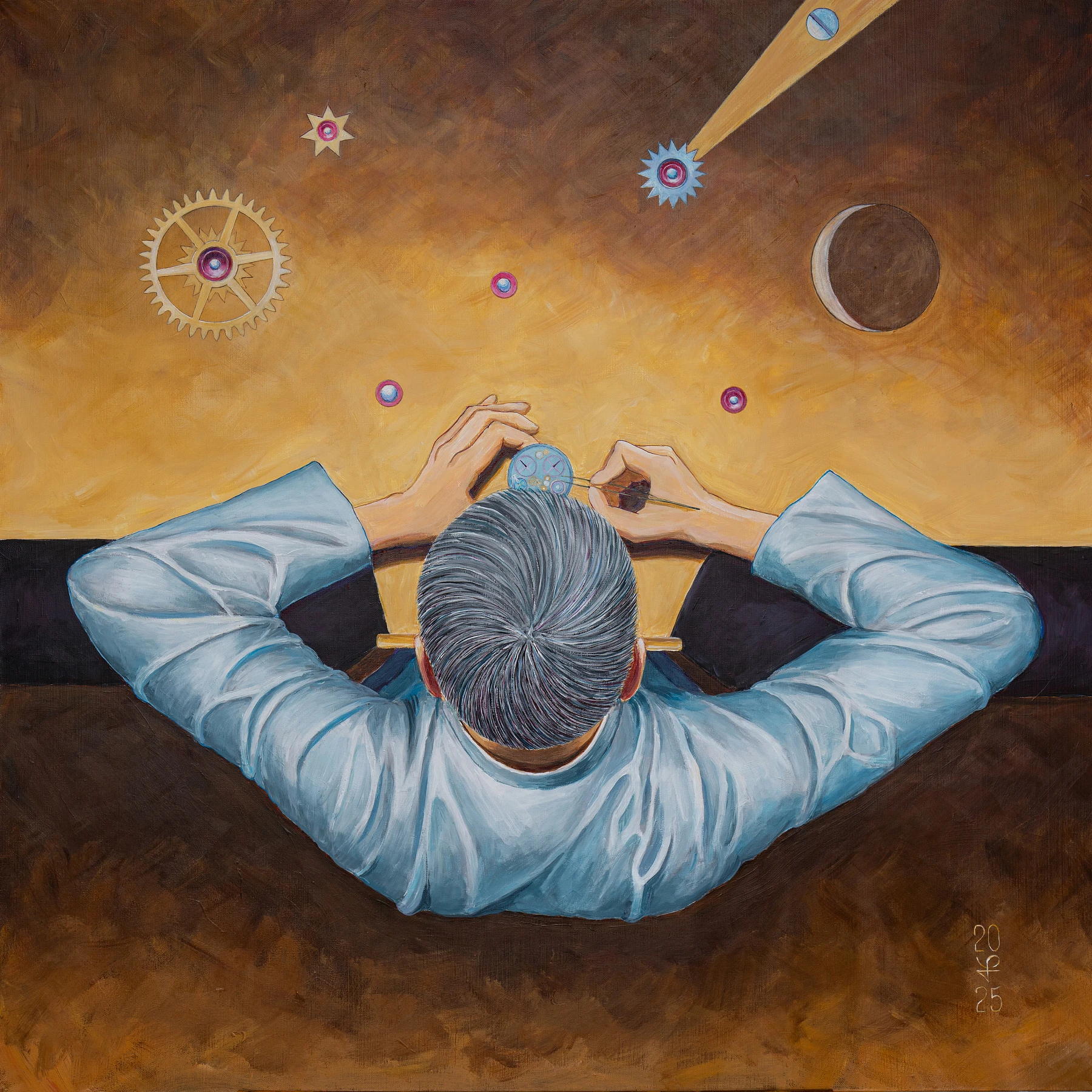 The master's workbench precisely divides the canvas in half. The surface of the table seems to rotate vertically, transforming into the sky. On it, gears take the form of the Moon, the Sun, and the stars. This is a metaphor for the fourth day of creation, when celestial bodies began to separate day from night.