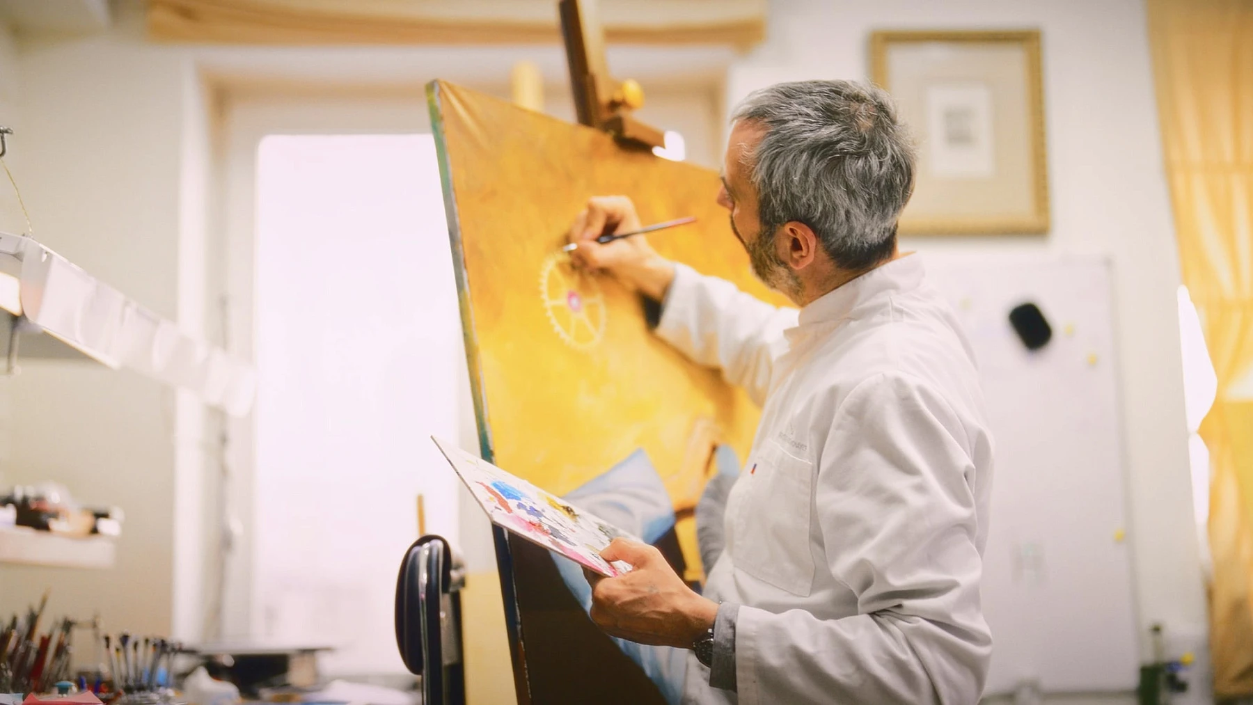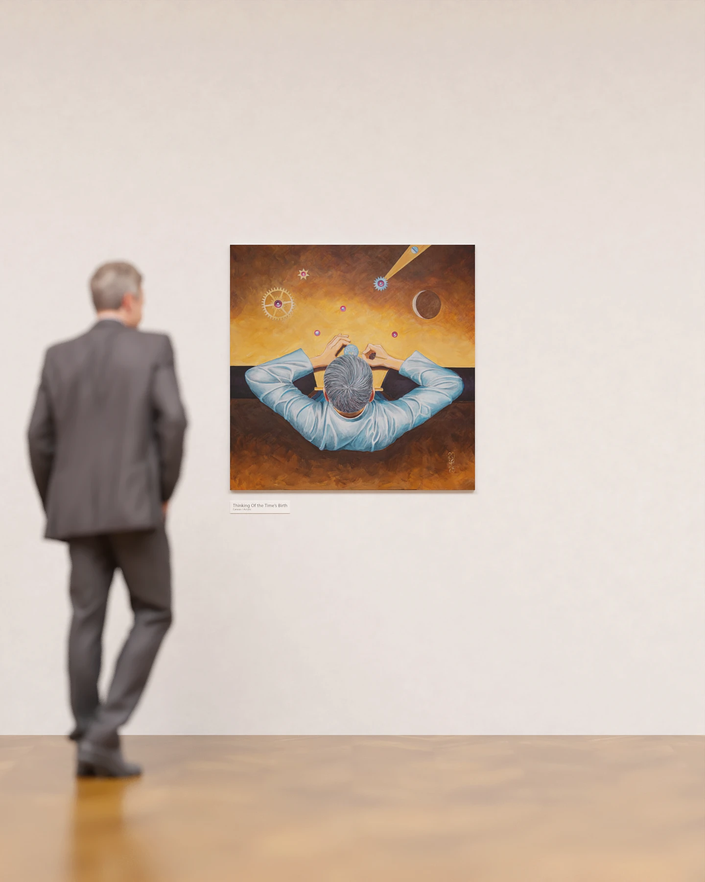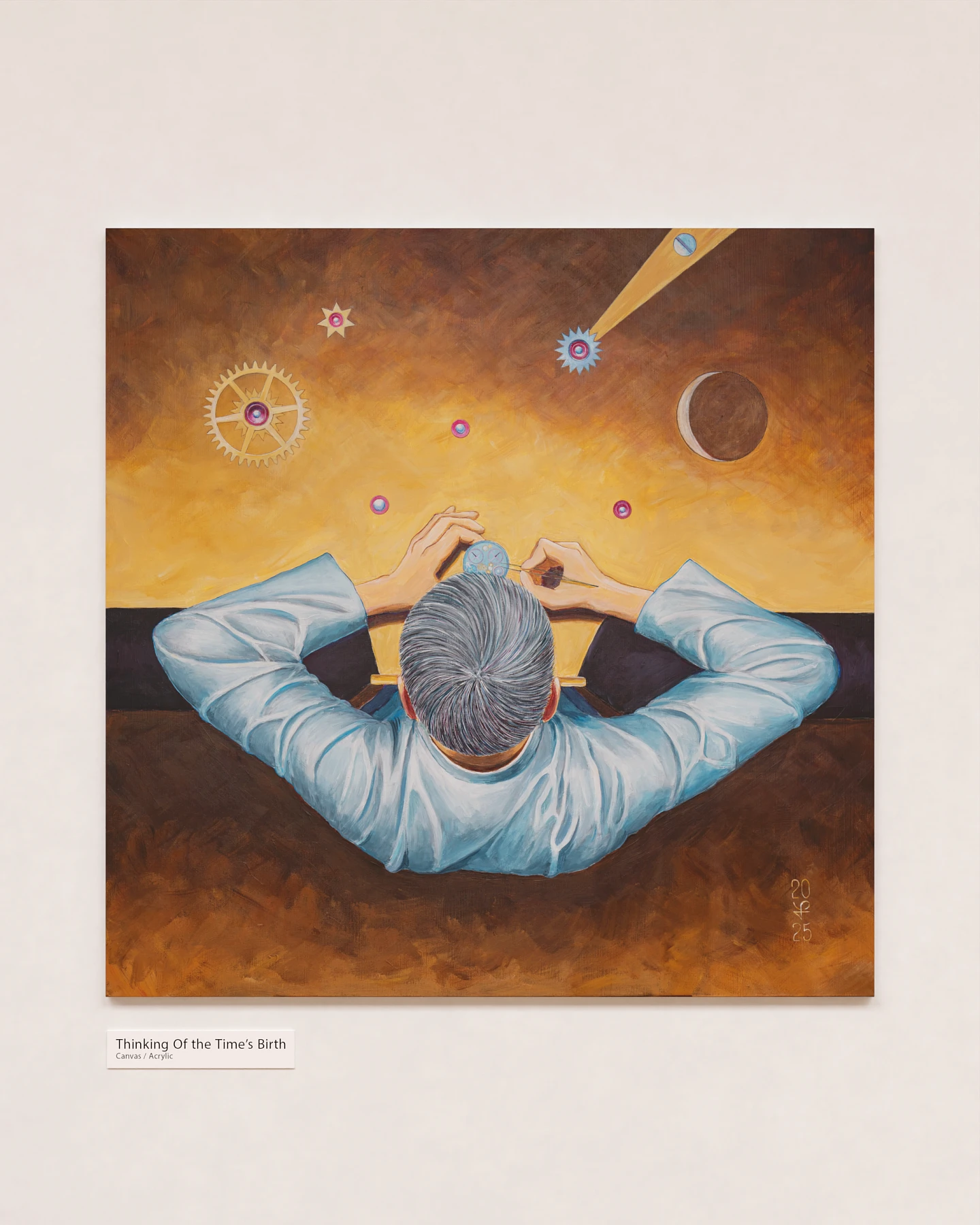 "Thinking of the Time’s Birth” is more than just a self-portrait of the master. The painting invites the viewer to experience awe in the face of mystery, where human inspiration and the 'breath' of the universe merge in a single creative act. Here, the biblical theme of creation, theology, the experimental spirit of modern watchmaking, and the subtle, almost mystical contrast between the micro-world of watch mechanisms and the vast expanses of space intertwine. In this realm, a new watch becomes a new form of life, and its creator transforms into a conduit of the hidden forces of the cosmos.